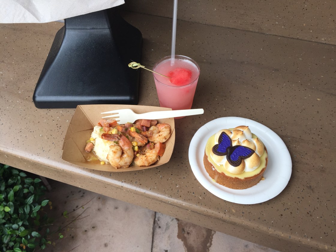 The Florida Fresh Kitchen was in between the Morocco and France Pavilions with a tidy little garden, a play area, and some chairs to relax in. This matched the menu perfectly: local flavors made fancy but accessible for anyone. The shrimp and grits were full of fresh corn, peppers, spicy Andouille sausage and plump Gulf shrimp. The grits themselves were amazing. I could eat a pot of that alone. The key lime tart was very sweet and little more runny than I thought it would be. The chocolate butterfly was a pretty touch. The slushie though: cool and refreshing with just a touch of sweet from the watermelon. And it had gin. Made me relax.