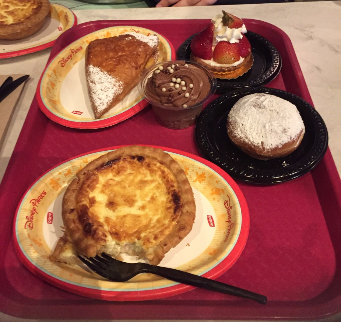 Again, I cannot lie: we ate it all and we loved it. The quiche was a great savory start to the day. Sometimes the pastry crust can be too thick and sticks in your throat, but not this one. The size was perfect and the ingredients were well-balanced: not too much cheese, not too much lardons. The chocolate mousse was rich, but went well with our other pastries. The brioche was heavenly, and the filling of raspberry jam made it the best doughnut you could get before Disney started selling their own doughnuts. The strawberries in the tart were amazingly fresh and sweet, not tart at all, and the glaze wasn’t heavy. The cream was a bit thick so we did have to ration the berries to get through it all. The Frangipane was my favorite. The pastry is a laminated dough, like a croissant, but inside is a tasty almond paste like you’d find inside a bear claw. It was sweet and nutty without going overboard.