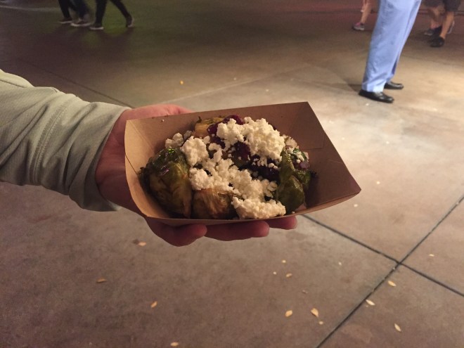Busy Bumble was also on the lookout for the Brussels sprouts with goat cheese, cranberries, and bacon. Brussels sprouts have gone through a renaissance and you can find them anywhere, now including the Disneyland resort. While these weren’t as crisp as we’d have liked them from a restaurant, they were still flavorful without the bitterness that accompanies badly-cooked Brussels sprouts. They are generous with the goat cheese (which I happily let Busy Bumble consume). The bacon is a typical addition with Brussels sprouts but the cranberries were a surprise. Busy Bumble thought better of them than I did and I think it may have been an attempt to make the dish seem more holiday “festive.” Honestly I could have done without them.